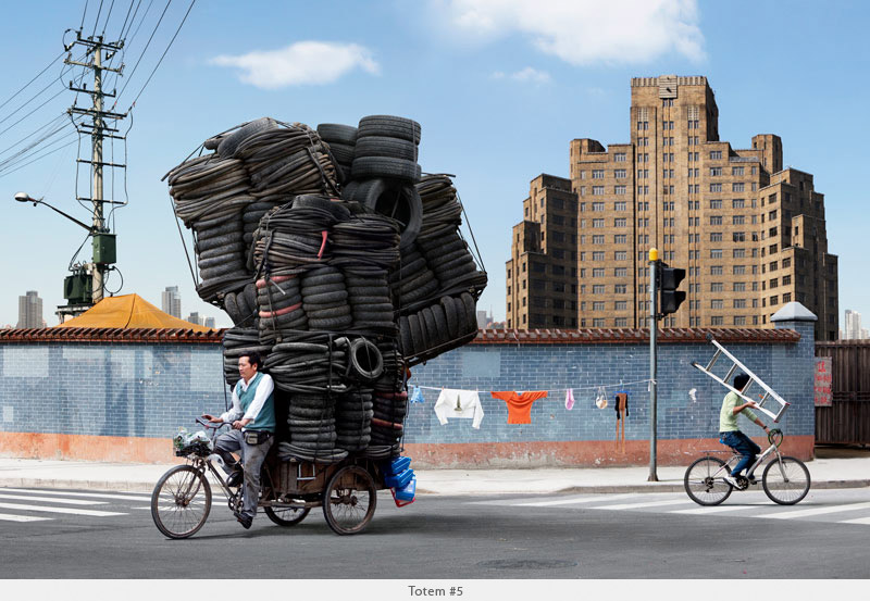 今度はリアカーに目一杯のタイヤを積み失踪する中国上海の出稼ぎ労働者の写真。これだけの荷物を積んですごいと同時に、その運転技術にも目を見張るものがある。