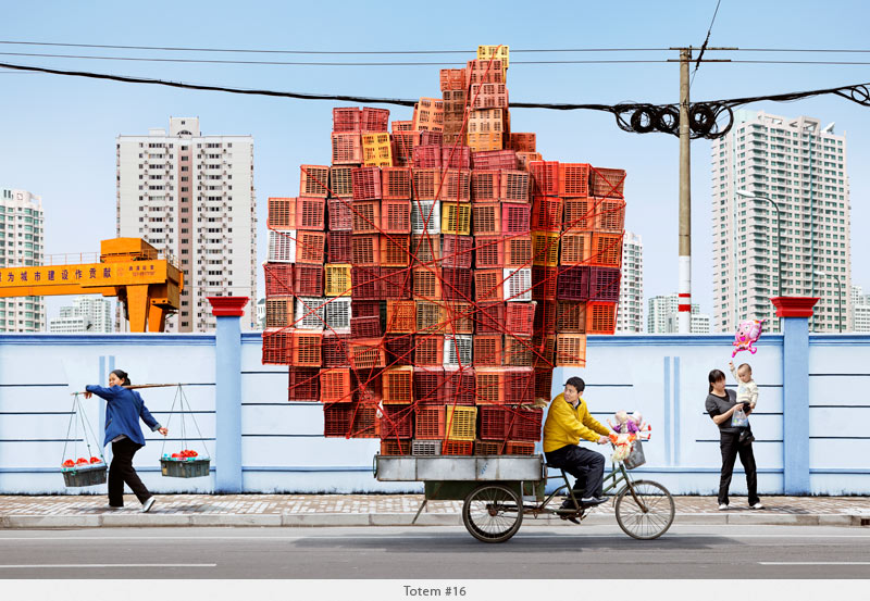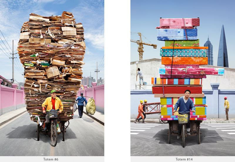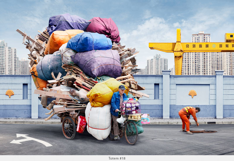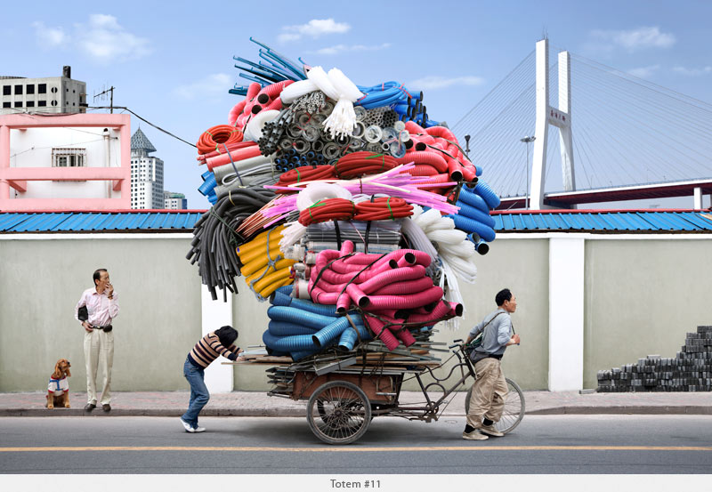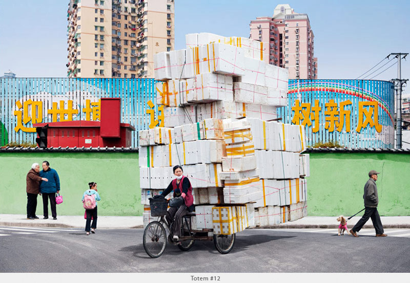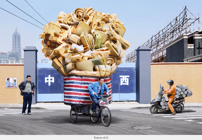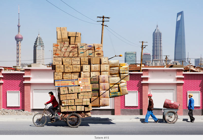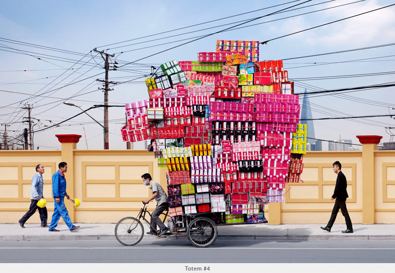 段ボールをこれでもかというばかりに積んでいる中国上海の出稼ぎ労働者。その後ろを平然と歩いている人のことを一瞬でも心配してしまう写真だ。