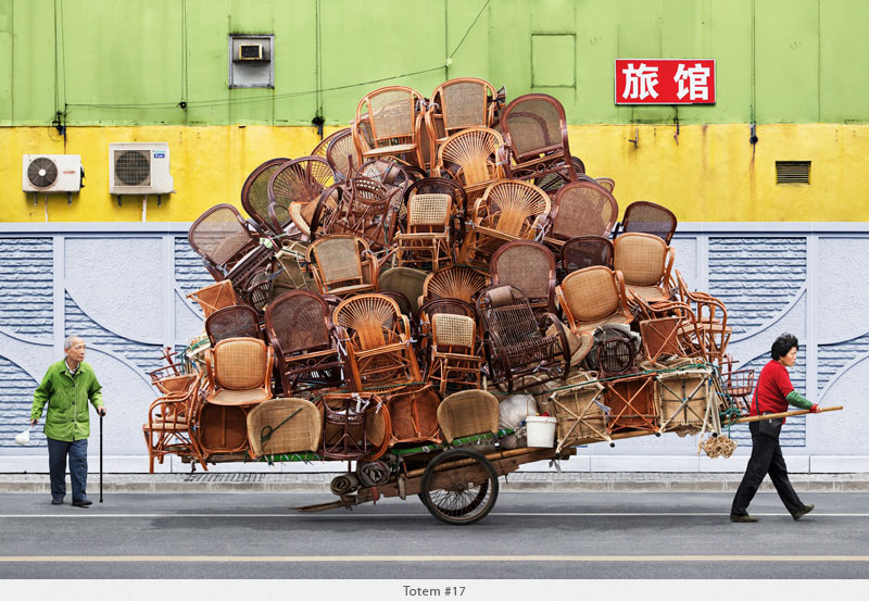 たくさんの椅子をこれでもか!というほど積み上げリアカーをひいている中国上海の出稼ぎ労働者。