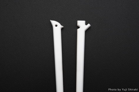 そしてこれが実際の箸。片方にキツツキ、もう片側にキツツキのくちばしによって窪んでしまった木をデザインすることで、ひとつでいっついになるようにわかるよう、デザインされているなんとも可愛らしいおはし。