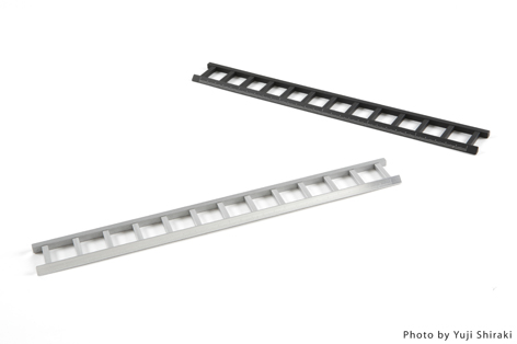 色の違う二色のはしごの定規。こうしてたてかけるとミニチュアのはしごのよう。定規として機能しないときも、いろいろな使い方が提案できそうな・・・いろんな可能性を感じ取ることができる定規だと思う。