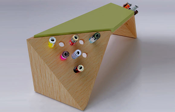 正面から見ると不安定な形状にみえなくもないが、斜め上から見ると土台がしっかりしていることがわかる。美しい木目調の素材もアクセントとしてこのベンチに彩りを与えている。