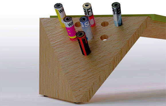 マガジンラックの部分は、側面の部分を利用している。しかもちょっとしたデザインとして機能するよう丸い穴の中に丸めた冊子を差し込むという面白い発想に落ち着いている。