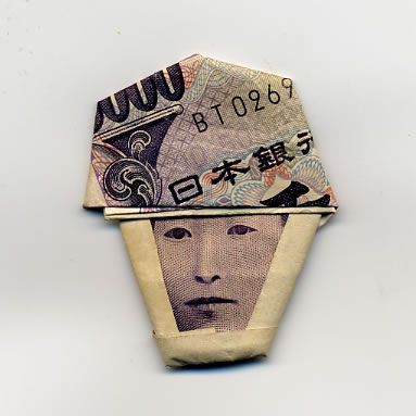 まず一枚目。お札の人物がちょうどハットをかぶっているかのように折り紙が折られている。