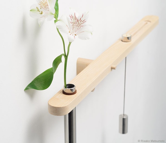量るものの重さを支点からの距離で読み取る秤。WATER BALANCEは、この秤の仕組みを使って、もの言わぬ花の渇きを視覚化します。始めは釣り合っていたはずの花器と錘ですが、花器の水が気化するにつれて均衡を崩し始めます。秤の傾きが静かな花の声となり、視線の先にある機宜を知らせます。