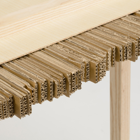 上下が細い木で出来た空洞の中に段ボールを敷き詰める。非常に面白いアイデアだ。