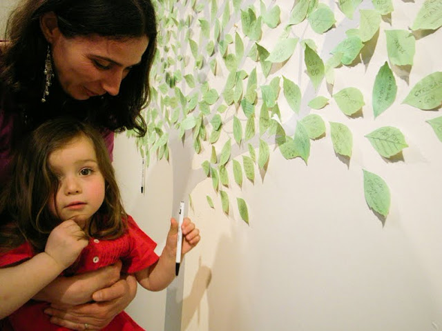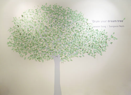 大量に貼付けられた葉っぱの付箋。たくさんはりつければ一品の木のようになる。右上には「Draw your dream tree」とある。