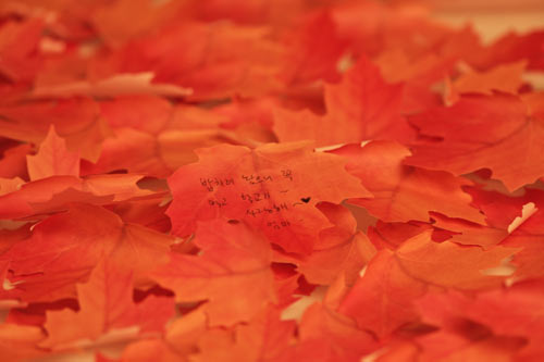 文字を書いた状態が上の写真。付箋であるポストイットが葉っぱの形になるだけで、こんなんもおしゃれになるなんて驚き。