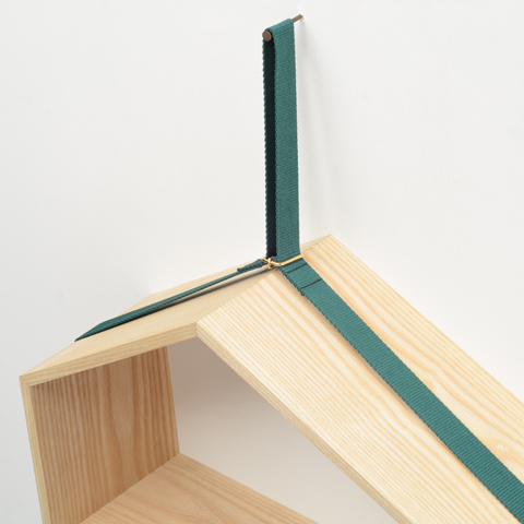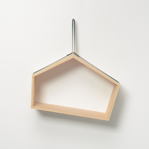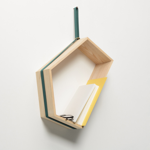 五角形の棚の中におくものによって重心が異なり、その重心によって棚の傾きが変わるというユニークなアイデアの棚の名前は「SLING」。