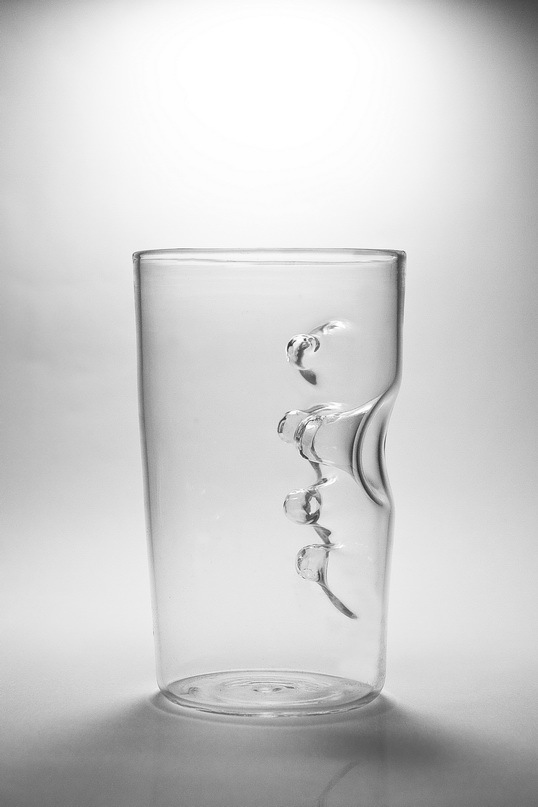 こちらがガラスのコップの中に持ち手がついているグラス「Finger-In」。名前の通り指を凹みの中に入れてもつ非常に独創的なグラスだ。