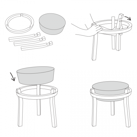組み立て方をみると非常に不安定にみえますが、座面にコルクを使用することでその強度を補っています。座面に座ることにより、強度が増すスツール。よく考えたものです。
