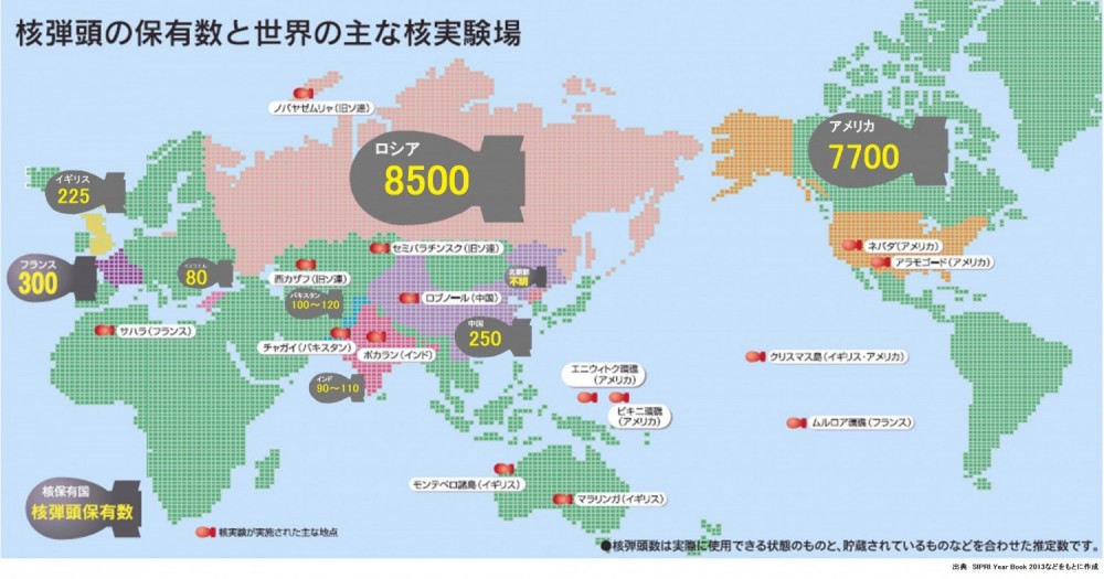 また長崎市のホームページに記載されている「核弾頭保有数と世界の主な核実験場」の図が保有数と国をわかりやすく表現してくれています。
