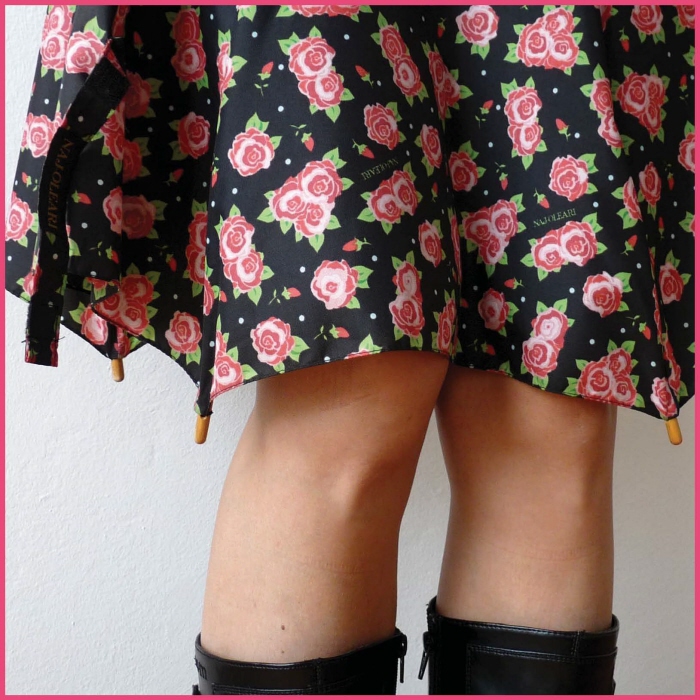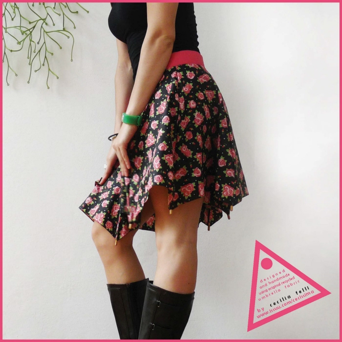 上の写真が傘の素材で出来たスカートです。 黒の生地に赤いバラが良いアクセントとなっていて素敵なスカートとなっています。