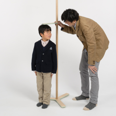 位置を自在に変えられるフックを使い、身長計のように家族で身長を測り、その高さに服をかけることができるコートラック「growth」3