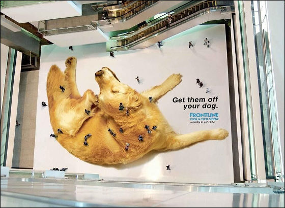 これ、なんの広告だかわかりますか?実はコレ、ペットのノミ取りスプレーの会社の広告です。高い位置からみると初めてわかる広告です。