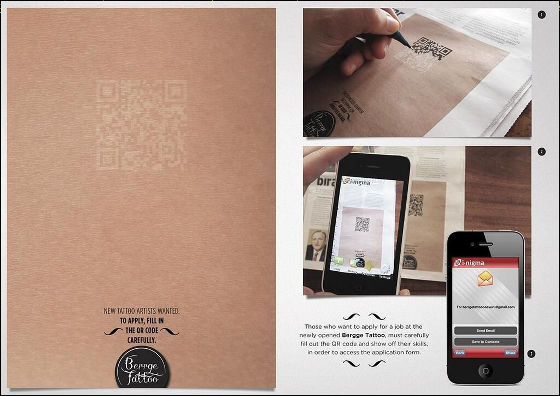 これはまた面白い広告です。実はこれBerrge Tattooの求人広告となっています。実はこれ、左側の薄く書かれているQRコードを綺麗に塗らないとQRコードを読み取ることができません。