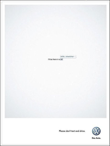 これもまた面白い広告ですね。フォルクスワーゲンの広告なのですが車の写真はひとつも見当たりません。そのかわり中心部には「I’ll be there in a(そこに行くよ)」と書かれており、その上には、「while(もう少しで)」「wheelchair(車いすで)」と予測変換の文字が書かれています。