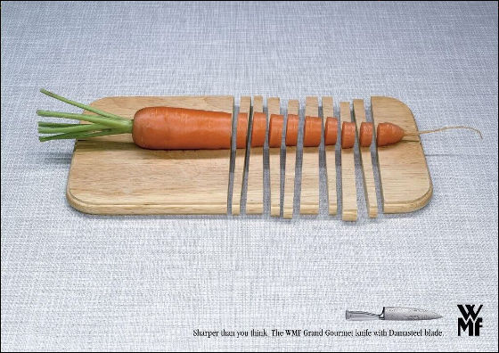 1853年に設立され、150年もの歴史をもつキッチン用品のドイツの老舗ブランドWMF(ヴェーエムエフ)の広告です。にんじんを切ろうとしたらその下のまな板まで切ってしまいました。