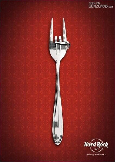 ハードロックカフェらしい広告です。「ロックしようぜ」のジェスチャーである「コルナ」のサインがフォークで表現されています。