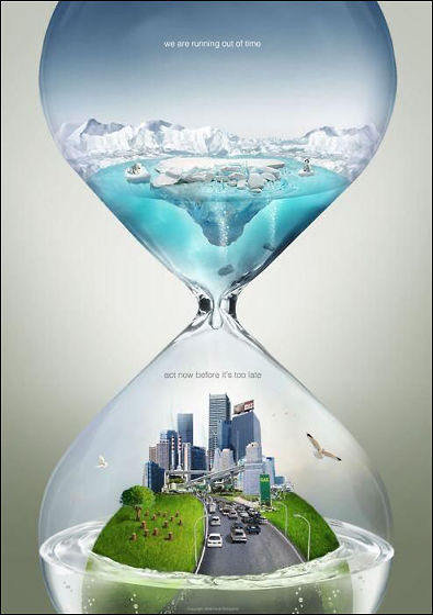 地球温暖化の啓発ポスターです。砂時計の上部には北極と南極を思わせる絵が描かれており、砂時計の下部に水が滴り落ちて行っています。そこにはこんな文字が「we are running out of time(私たちは使い果たそうとしています)」