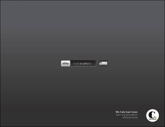 こちらは運転中のスマートフォンの使用をやめるようによびかける広告。iPhoneのロック解除のスライドスイッチが乗用車とトラックになっており、車の運転中に使用すると追突事故を招きますよ・・・という先ほどのフォルクスワーゲンの広告に近い内容となっています。