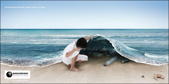 海の底をのぞいてみるとそこにはたくさんのゴミが・・・。海にゴミを捨ててはいけないということを表現する為のポスター。
