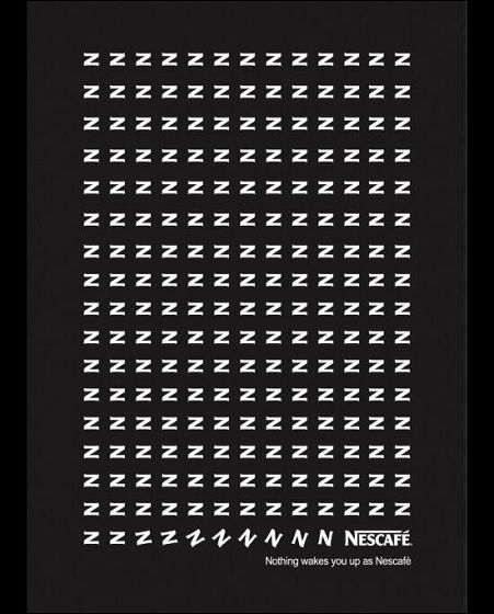 「zzz」と居眠りマークが続いているその先には、ネスカフェが。ネスカフェのコーヒーを飲めば、眠い状況もシャキッと改善!ということを示しています。