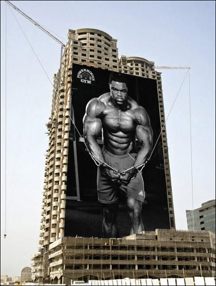 筋肉隆々のお兄さんがビルのクレーンをひっぱっています。このジムに通えばこんなにムキムキのマッチョになれるんですよということをアピールしている広告です。