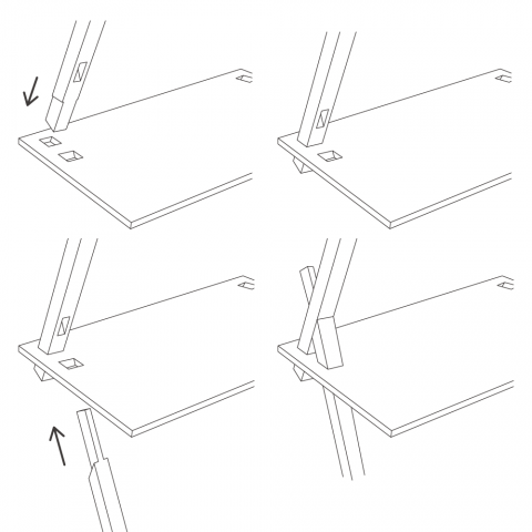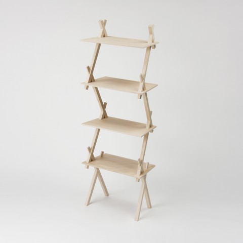 不安定かつ軽快なシルエットにみえながらも、その連結部分同士が組合わさることによってお互いがお互いを支え合う力を発揮し、さらに天板に加重がかかると、全ての接合部に締まる向きの力が加わり、より安定性を増す棚です。