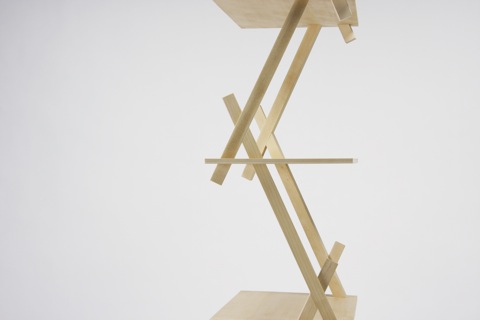 こちらがその棚。Design Soilの大学生がデザインした面白い棚となっています。「PROP」という名でみるからに倒れそうな構造をしていますが、お互いがお互いを支え合っているためそんなに簡単に倒れることはありません。