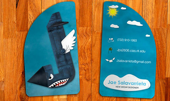 デザイナーのJae Salavarrieta氏の名刺です。デザイナーらしく一般的な名刺とは違いポップな印象が残る名刺となっています。