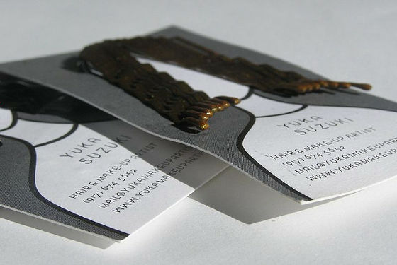 ヘアーメイクアップアーティストの名刺。ヘアピンを髪にみたてることに成功した、ユニークなデザインの名刺です。