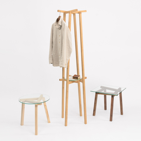 不可能図形「ペンローズの階段」のようにみえる、L字形の脚が互いに支え合うことで自立するコートラックとテーブル「LEAN」3