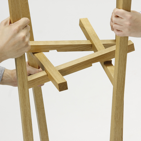 不可能図形「ペンローズの階段」のようにみえる、L字形の脚が互いに支え合うことで自立するコートラックとテーブル「LEAN」5
