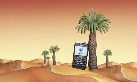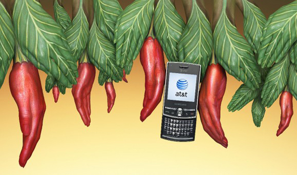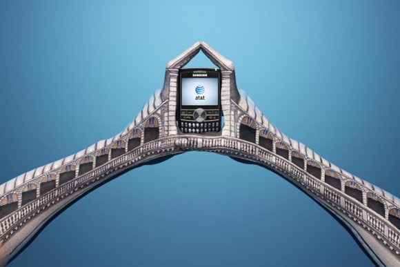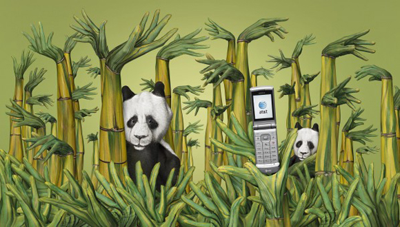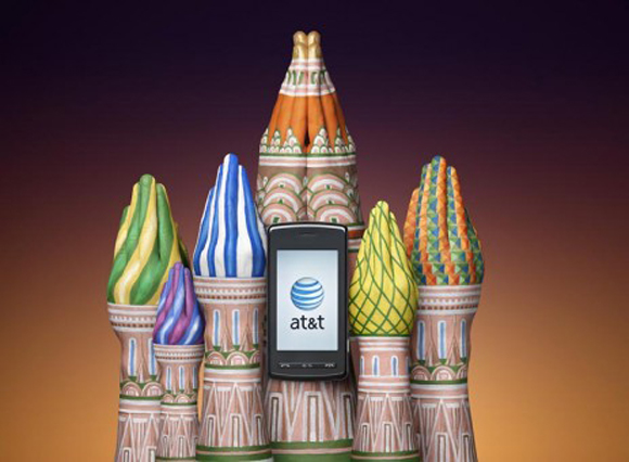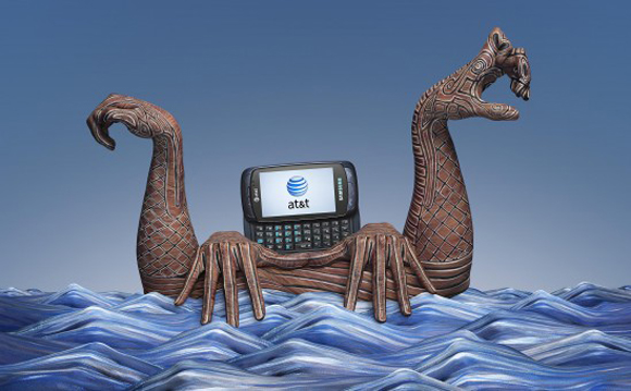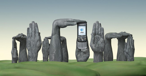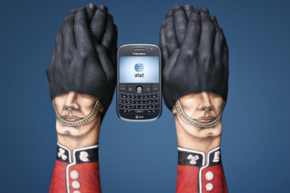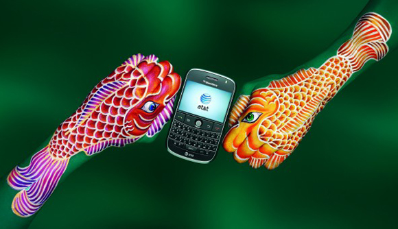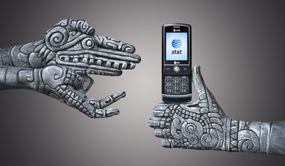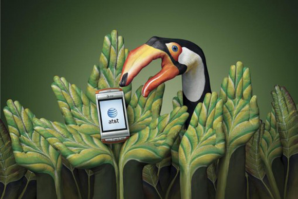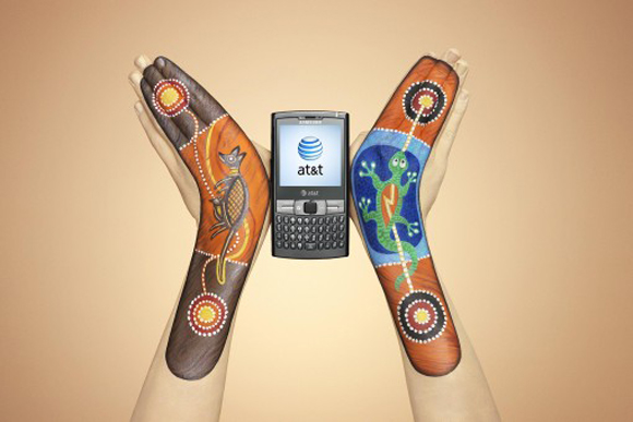 インディアンのブーメランを思わせるハンドペインティング。お互いのブーメランが真ん中のアメリカ合衆国最大手の電話会社AT&T社の携帯電話にぶつかり合っています。