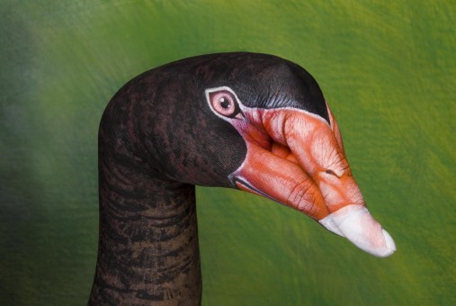 あのするどい鷲(ワシ)がこんな風にボディペインティングの技術によって繊細に表現されています。鷲(ワシ)の羽のひとつひとつも見事に表現されています。