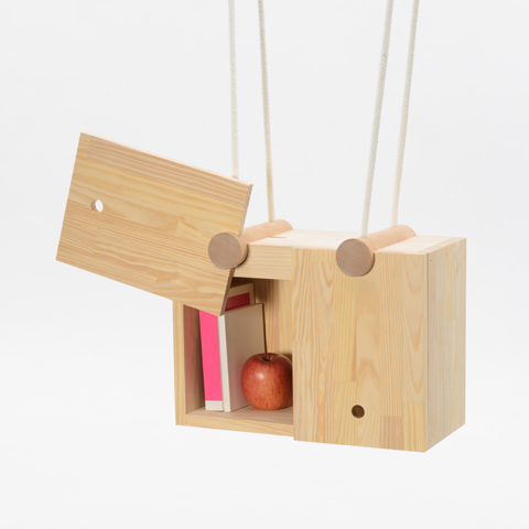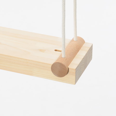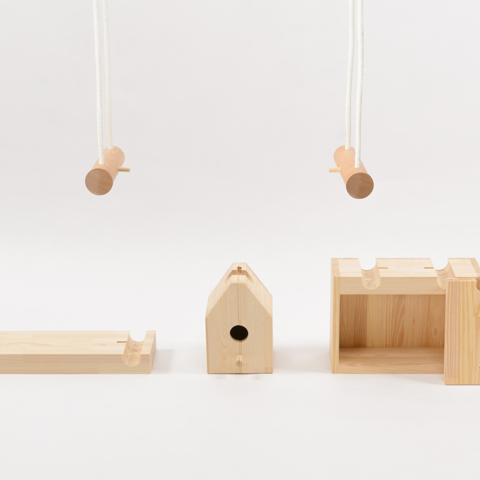 円周の半分以上と触れ合っていれば、その円と接する物体は持ち上げることができる。SEVEN – TENTHSは、この法則を応用した吊り下げ式のモジュール家具です。共通する機構をもった多様なパーツは、差し替えるだけで交換でき、収納棚や巣箱のほかブランコまで、思い思いの使い方を楽しめます。
