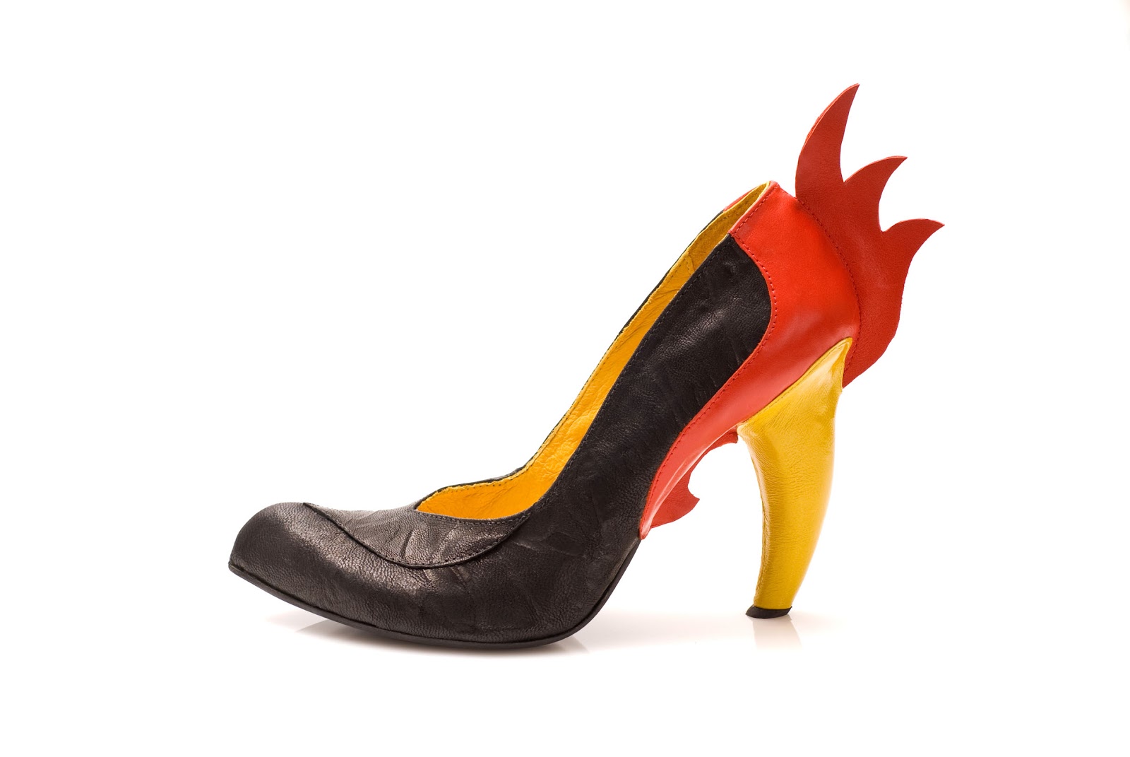 雄鶏からインスピレーションを得手で来たハイヒールです。とさかの部分が非常に光る作品ですね。