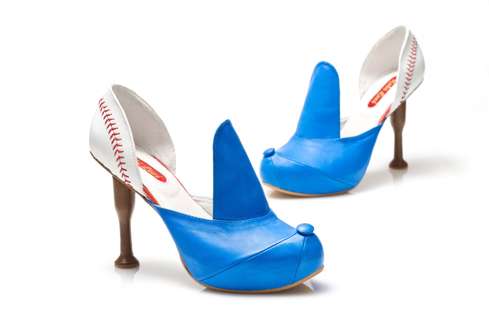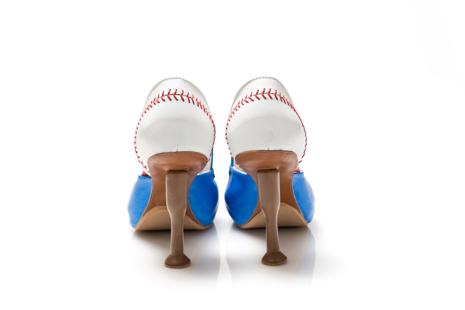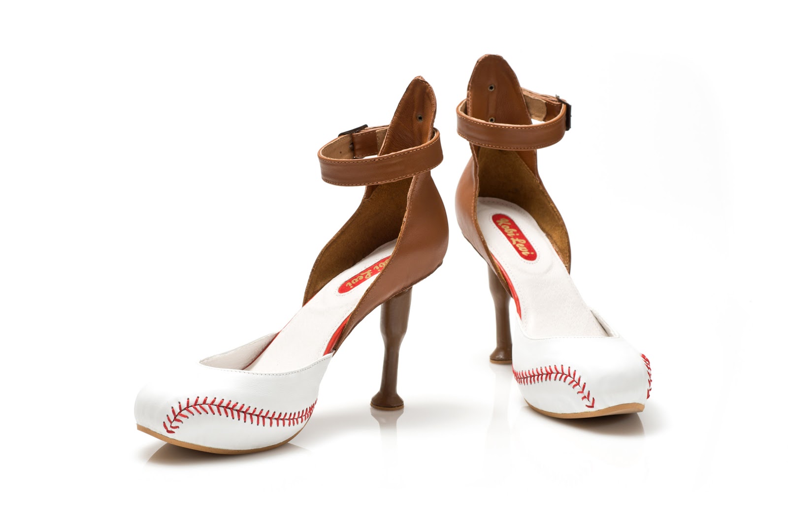 ベースボールキャップと野球のボールが向かい合うようにデザインされているハイヒールです。