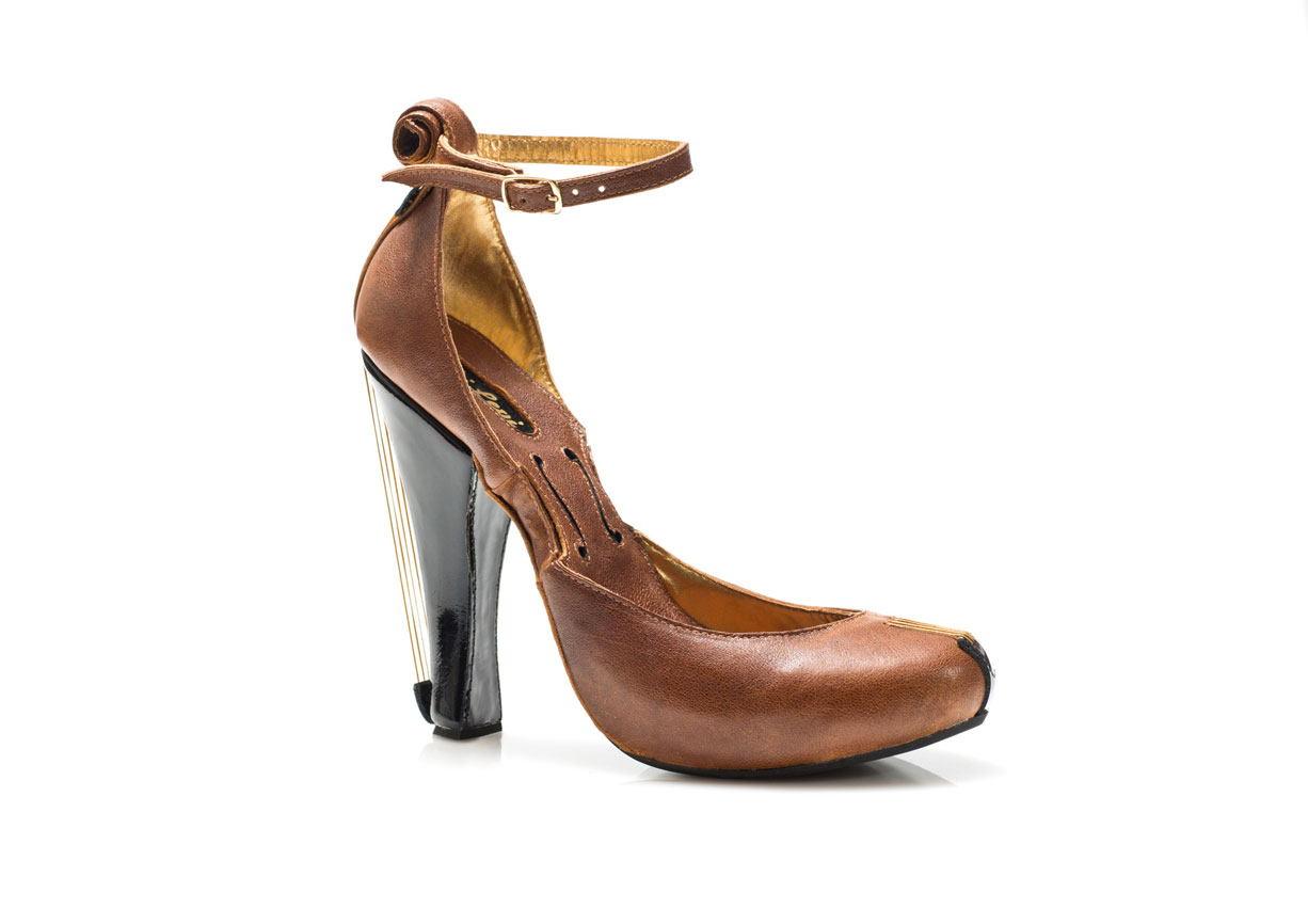ヴァイオリンからインスピレーションを得てハイヒールをつくった作品です。きちんとヴァイオリンの弦まで再現されています。