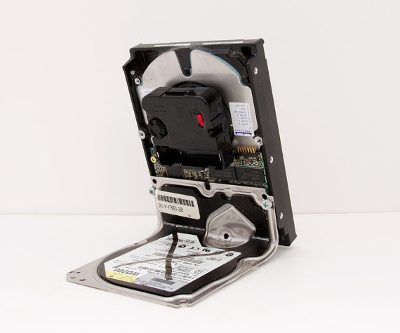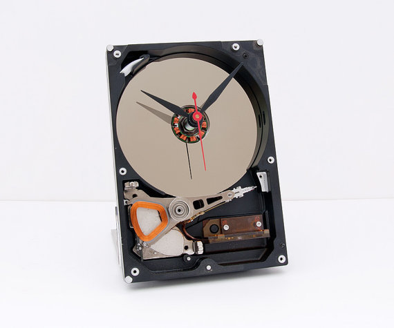実はハードディスクドライブで出来た時計、側面をみるとこんな状態になっています。自立できるなんて・・・なんてけなげなハードディスクドライブなんでしょう。