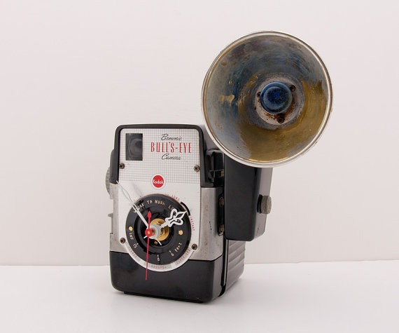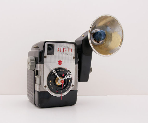 カメラレンズのところに時計の針が埋め込まれています。レトロなものが好きな方にはたまらない一品となっています。