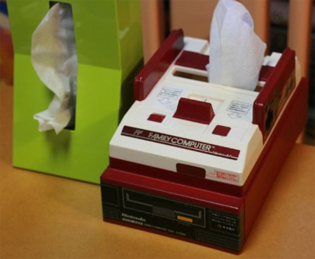 任天堂のファミコンのカセット挿入口からティッシュが出てくるように設計されたティッシュボックスです。