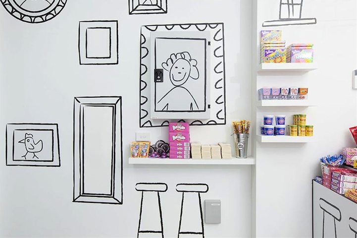 ストア全体は白を基調としており、真っ白な紙に黒いペンで椅子や時計、棚やキッチンなどが描かれたかのような内装となっています。