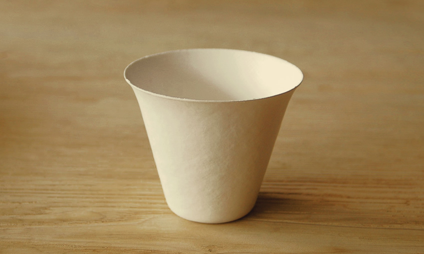 紙の器である以上、その命は儚く一回しか使うことが出来ません。しかし、原材料の葦やバガスはいずれ土に還っていく素材です。使われた器が土に還り、またそこから新しい命が生まれる・・・。