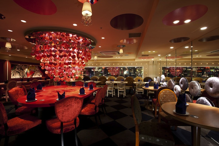 大きなトランプのデザインのダイニングテーブルや、トランプのデザインの照明など細部にわたり不思議の国のアリスの世界観を再現しています。