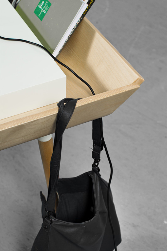 ちなみに机脇のエッジの部分の隙間からは上の図のようにケーブルを通すことができるように設計されています。また橋の部分に荷物などを掛けておくことも出来るようになっています。