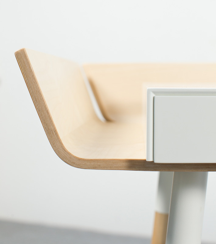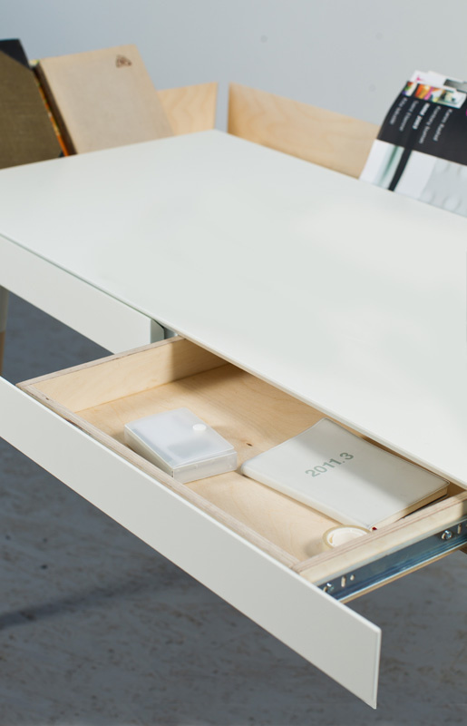 こちらは引き出し。驚くことにあまりモノが入るようには設計されていません。それはテーブルトップの脇に備え付けられているエッジの部分を有効活用する為でしょうか。