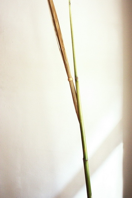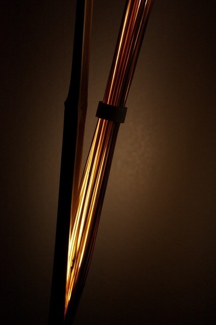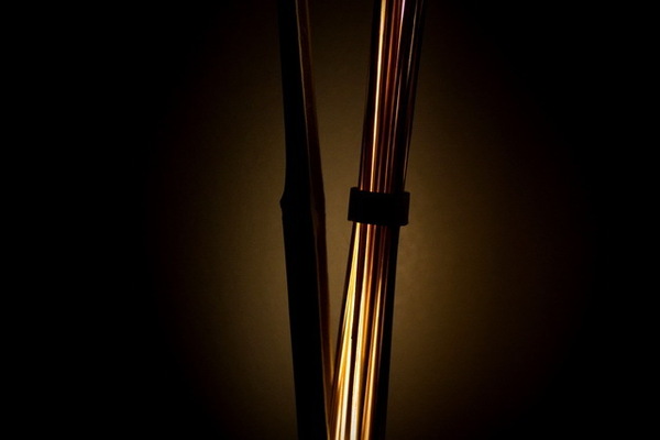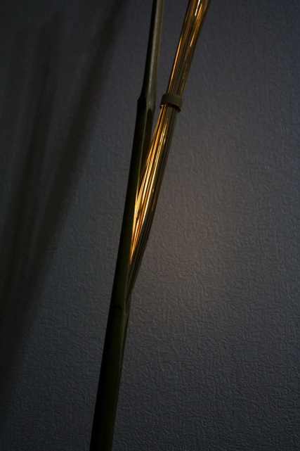 途中まで、まっぷたつに切り裂いた竹の片側だけに切り込みの線を入れ、その間を通して、こもれ出る光により辺りをほのかに照らす。非常におしゃれな竹の照明。