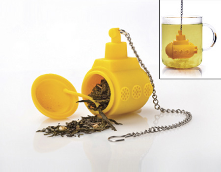 こちらはティーサブマリンというグッズ。黄色い潜水艦の中に紅茶の葉っぱを入れ使用します。こちらも使い捨てではなく、洗えば何度でも使えるティーバッグです。